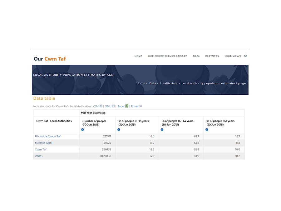 Our Cwm Taf was developed and is supported and hosted by Data Cymru in collaboration with the Cwm Taf Public Services Board. It offers partners and citizens opportunities to engage with and further understand the key role of the board as it develops. Our Cwm Taf also contains a wealth of information about the region. The website is also a crucial resource for practitioners to assist them in the ongoing monitoring of a wide range of datasets in order to identify what the priorities for focus should be.